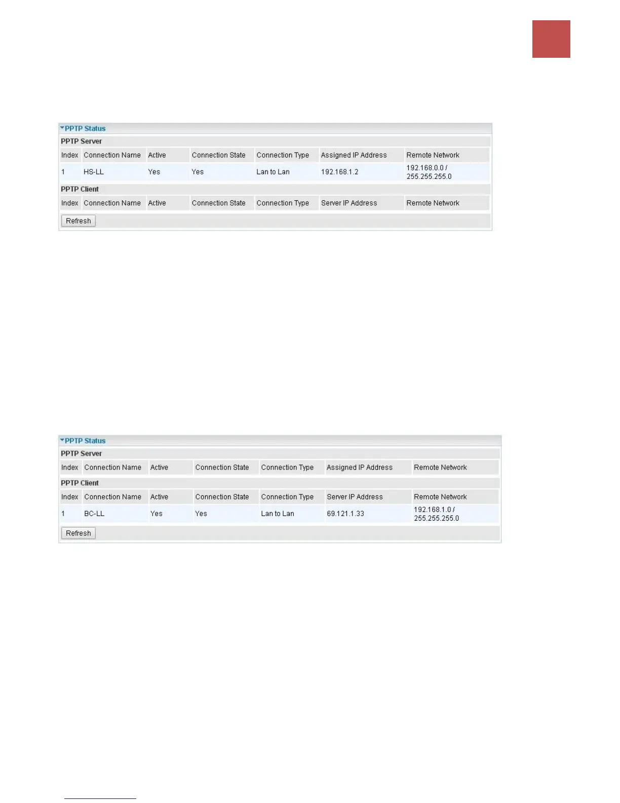 Remote Network: Display the remote network and subnet mask in LAN to LAN PPTP connection.