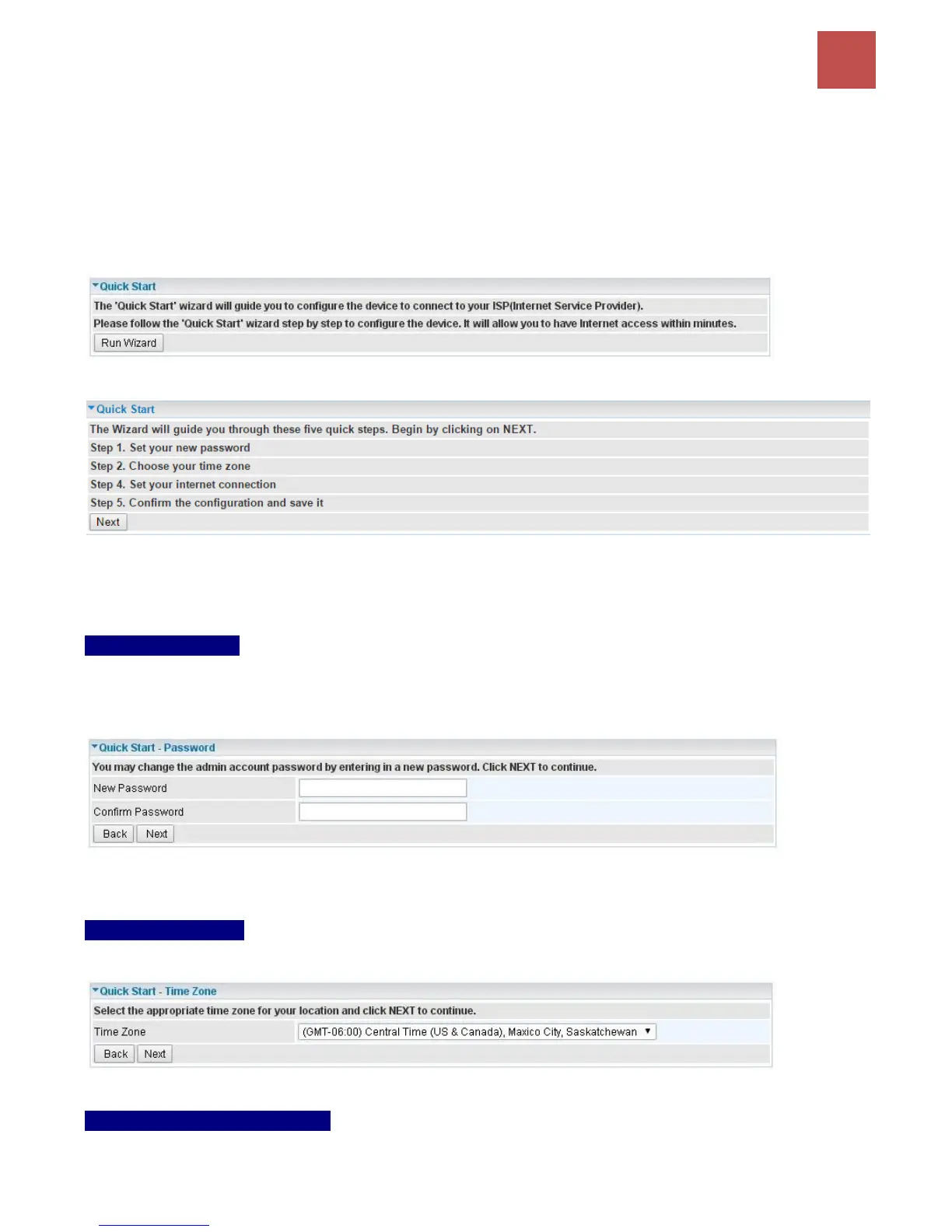 zone, wireless, and WAN settings of your device. The Quick Start Wizard is a helpful guide for the