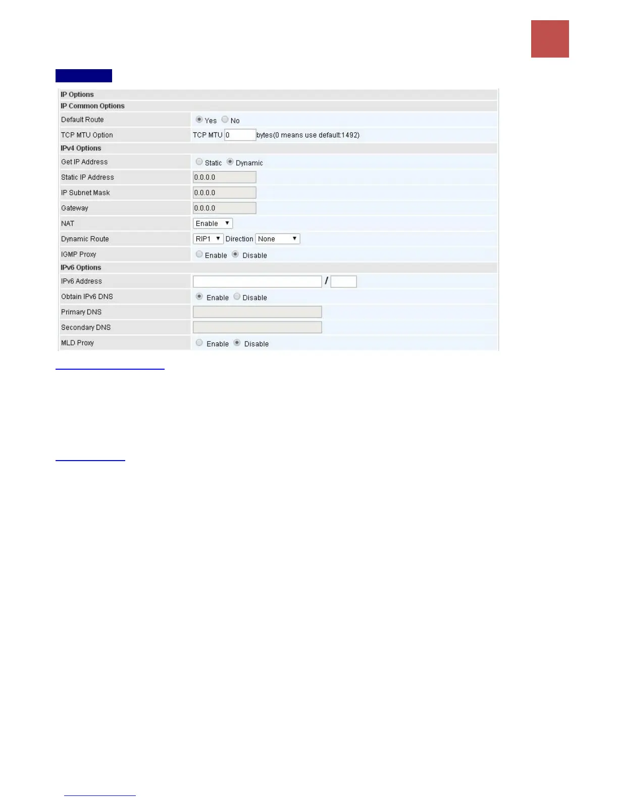 TCP MTU Option: Enter the maximum packet that can be transmitted. Default MTU 0 means it is set