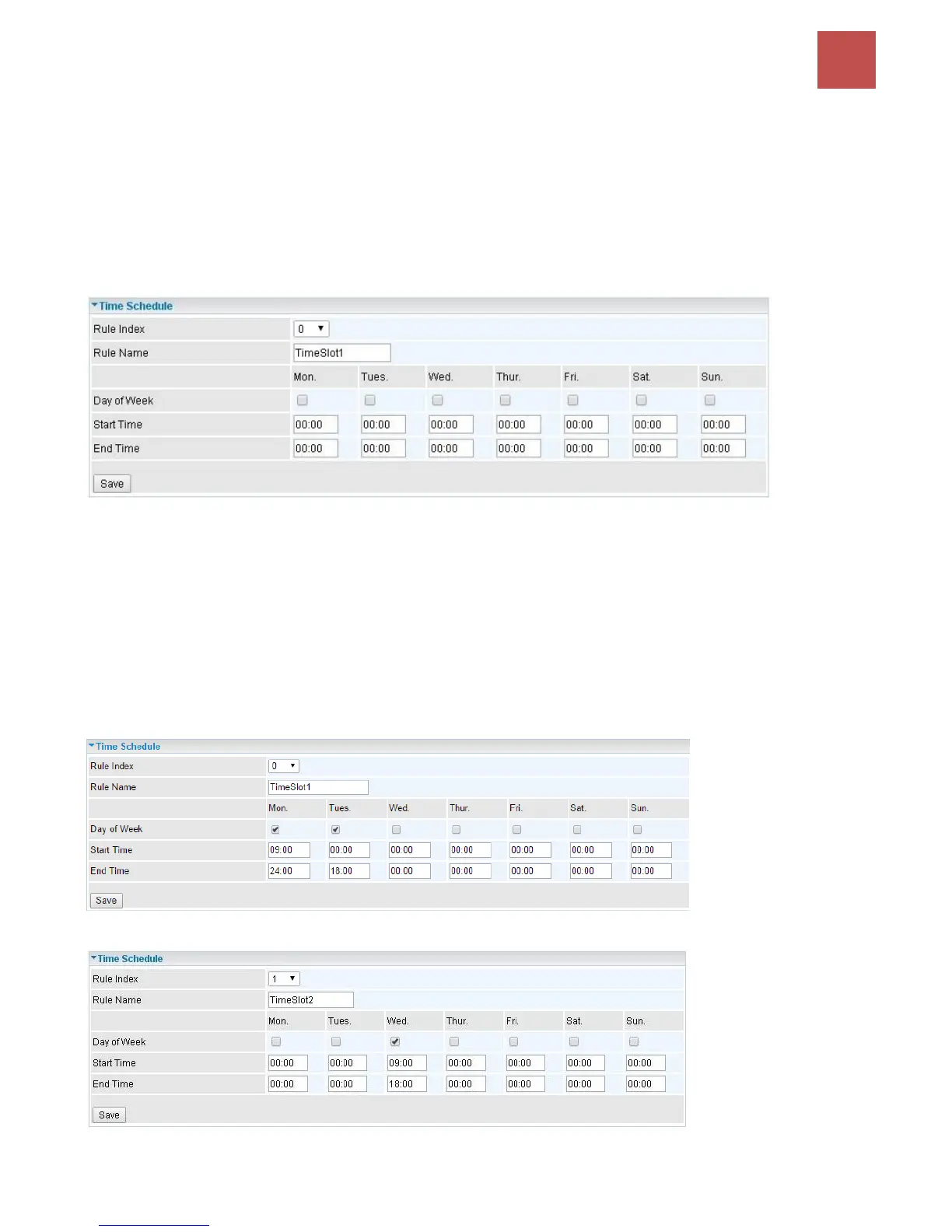 The Time Schedule supports up to 16 timeslots which helps you to manage your Internet connection.