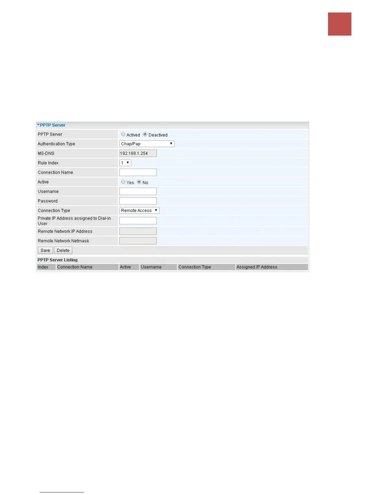 Rule Index: The numeric rule indicator for PPTP server. The maximum entry is up to 4.