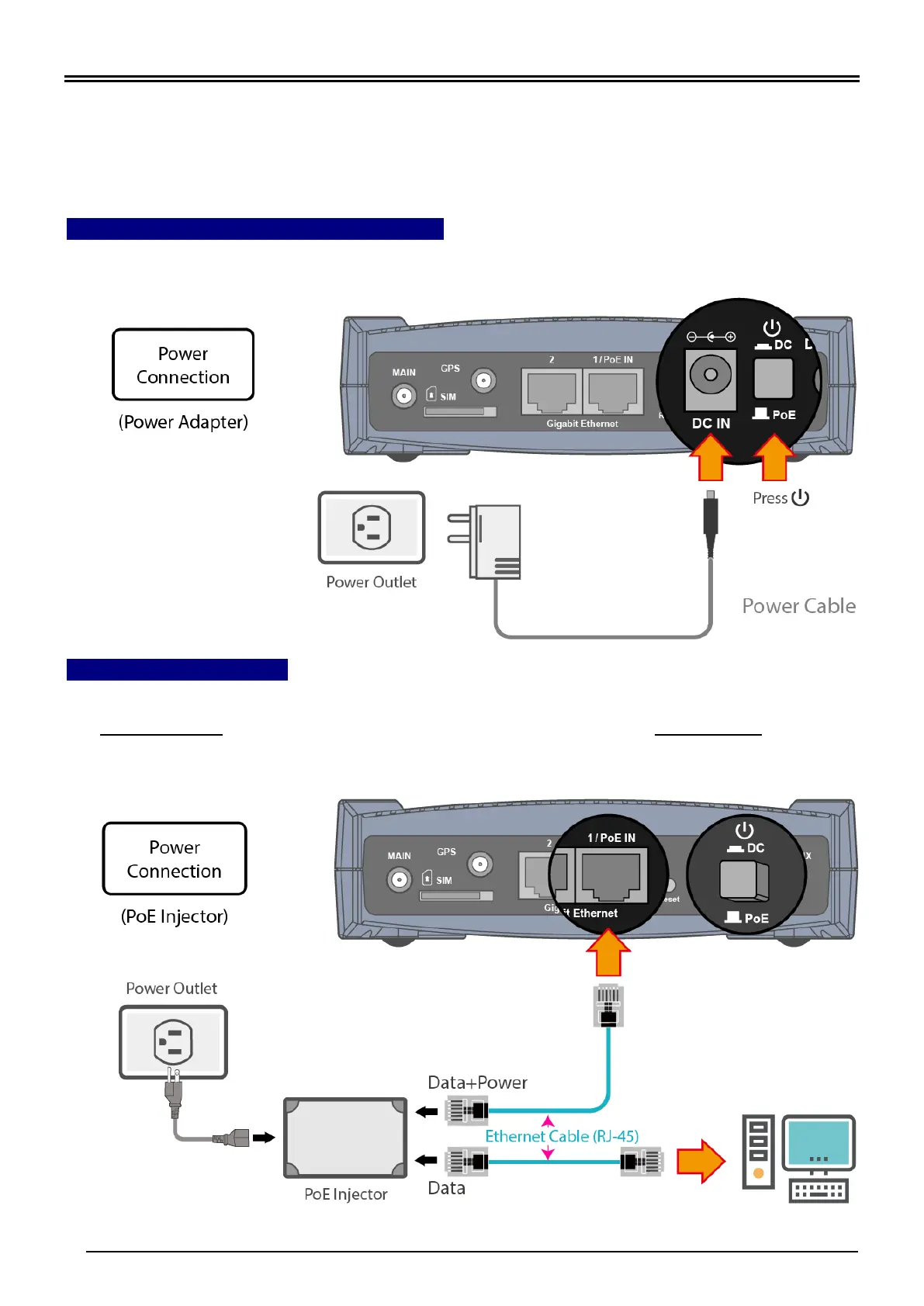 Select power source from using a (1) DC power adapter or (2) PoE Injector