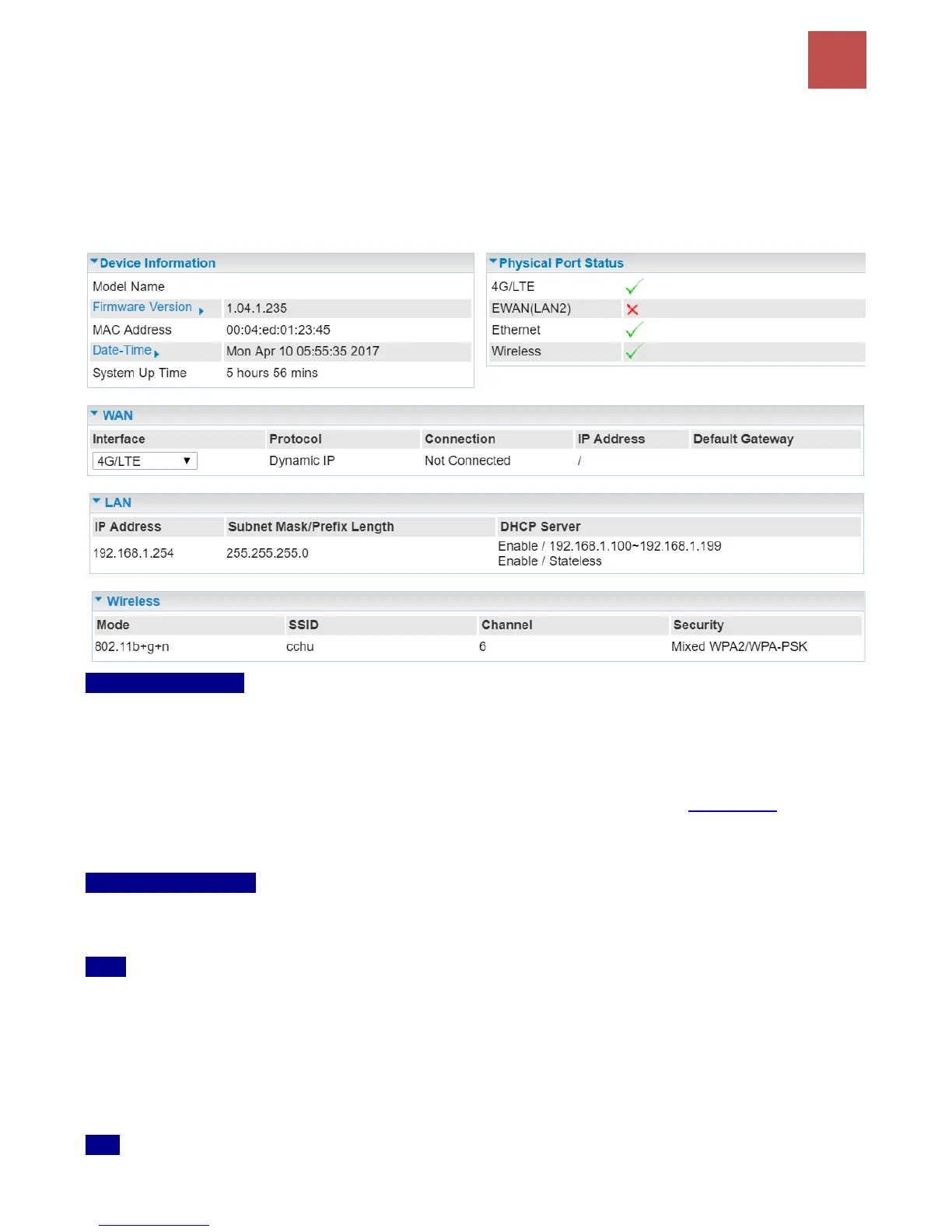 Physical Port Status:Display available connection interfaces, WAN (3G/4G-LTE, EWAN) and LAN