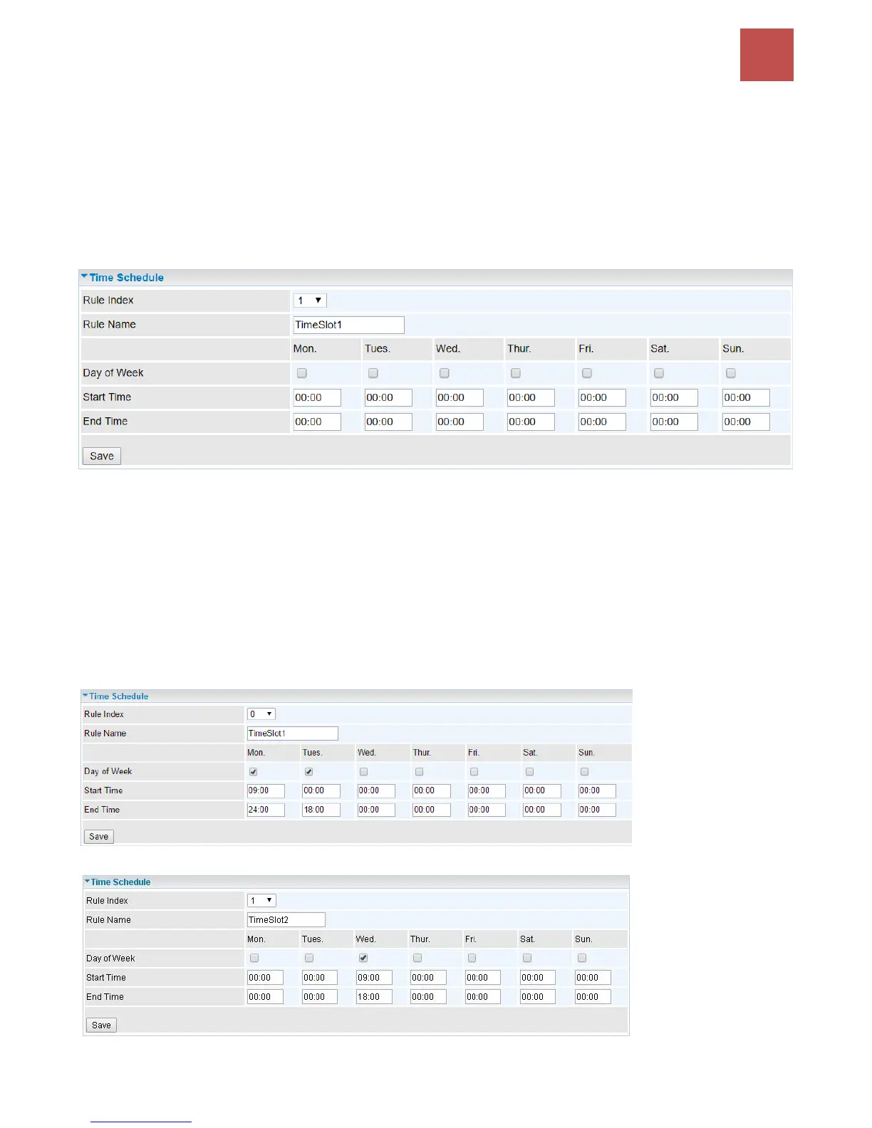 The Time Schedule supports up to 16 timeslots which helps you to manage your Internet connection.