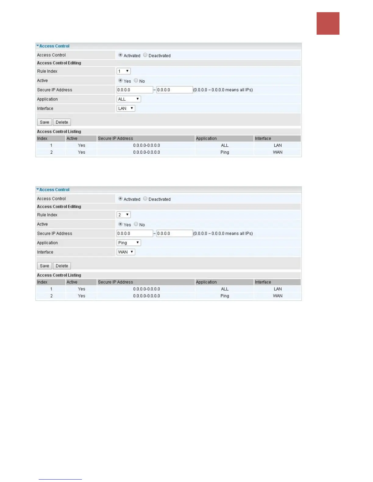 Default Rule 2: (Index 2), an ACL rule to open Ping to WAN side.