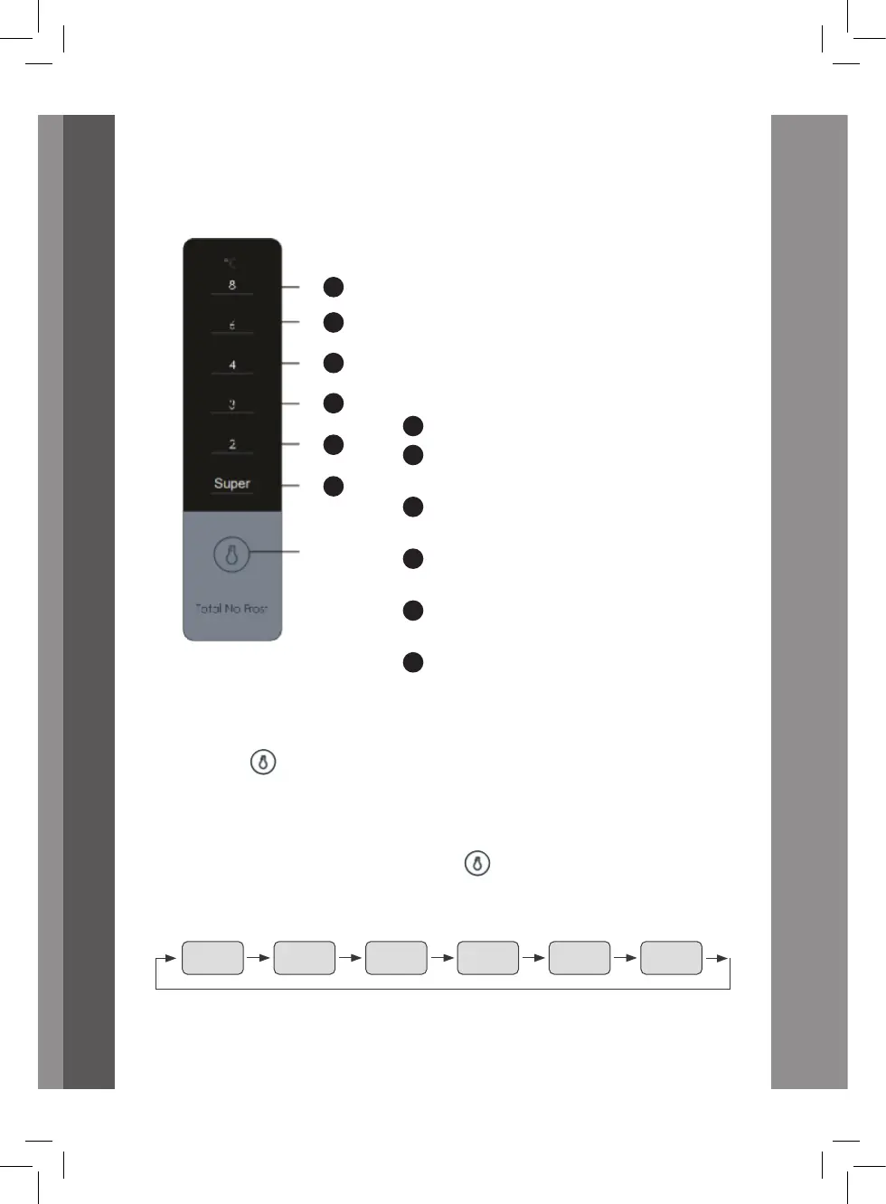 When the refrigerator is working, the icons (“Super”, “2”, “3”, “4”, 6”, “8”)