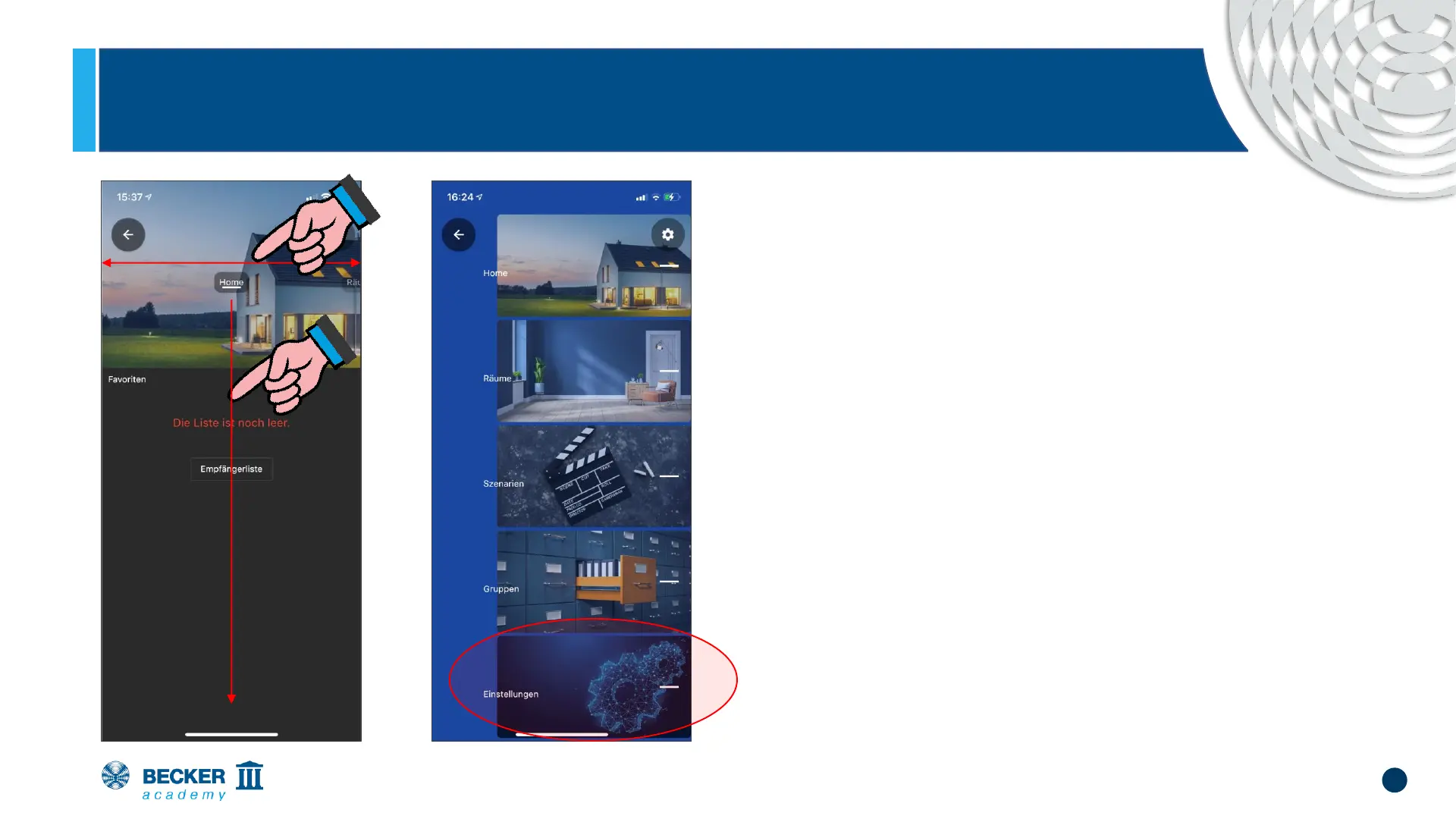 Select the item "Settings" by swiping or