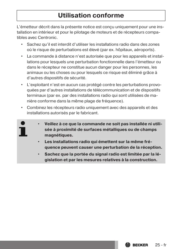 L’émetteur décrit dans la présente notice est conçu uniquement pour une ins-