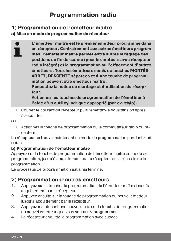 1.Appuyez sur la touche de programmation de l’émetteur maître jusqu’à