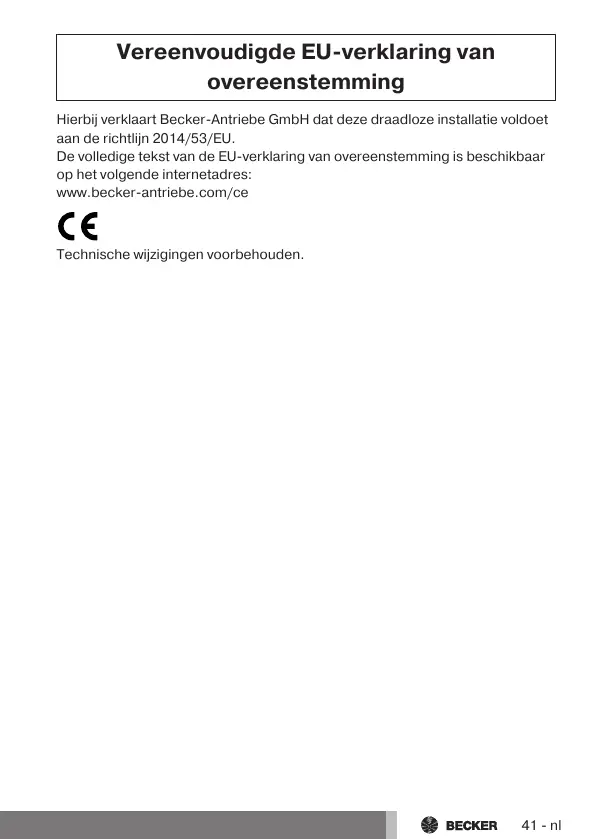 Hierbij verklaart Becker-Antriebe GmbH dat deze draadloze installatie voldoet