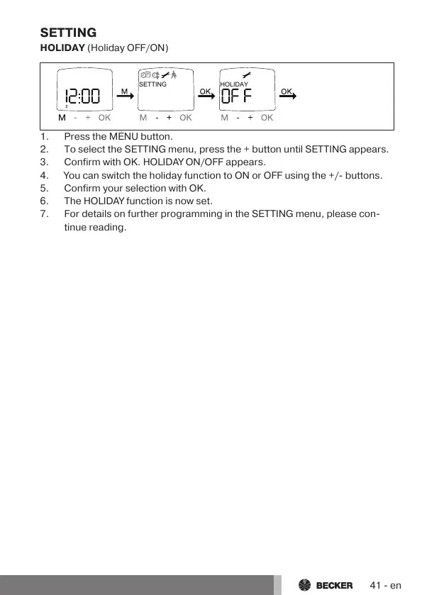 3.Confirm with OK. HOLIDAY ON/OFF appears.