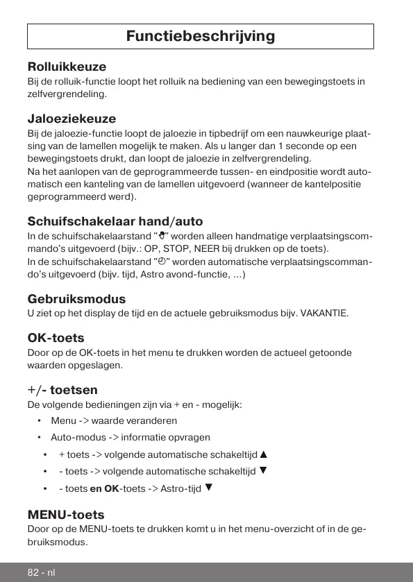 Bij de rolluik-functie loopt het rolluik na bediening van een bewegingstoets in