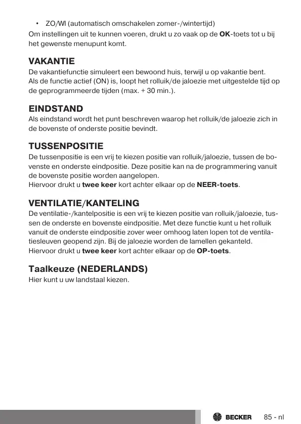 venste en onderste eindpositie. Deze positie kan na de programmering vanuit