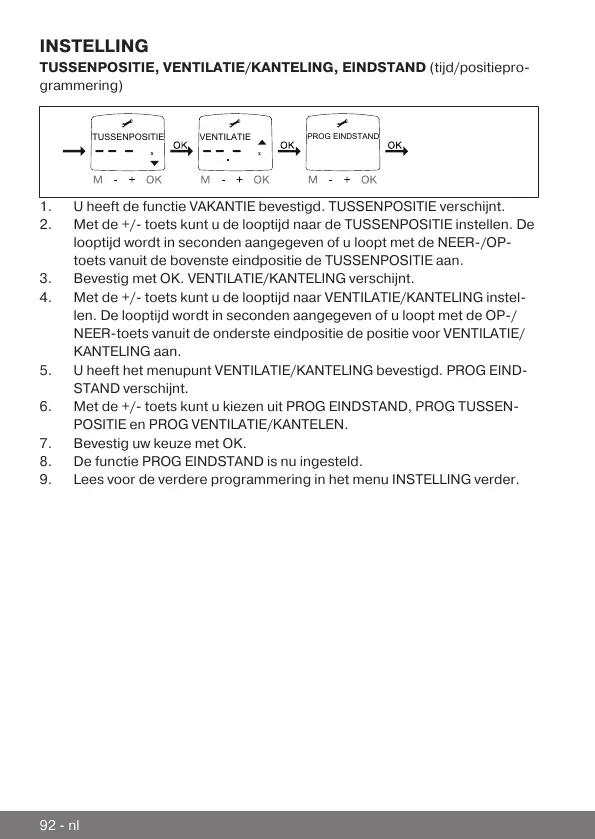 2.Met de +/- toets kunt u de looptijd naar de TUSSENPOSITIE instellen. De