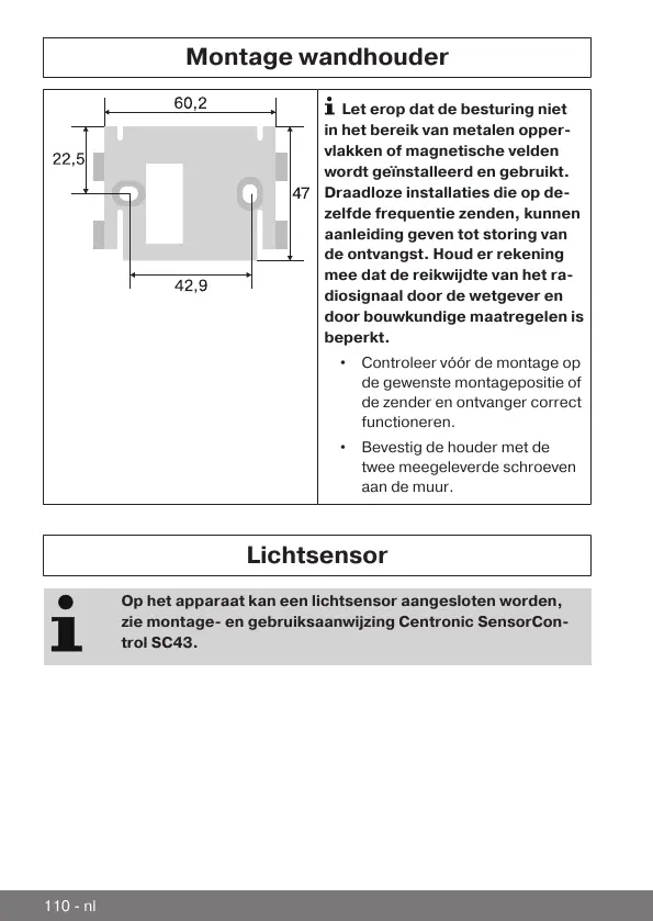 zie montage- en gebruiksaanwijzing Centronic SensorCon-