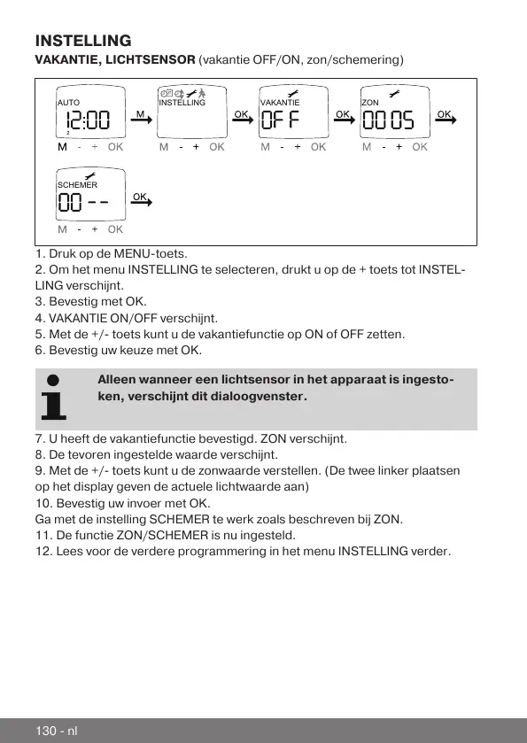 VAKANTIE, LICHTSENSOR (vakantie OFF/ON, zon/schemering)