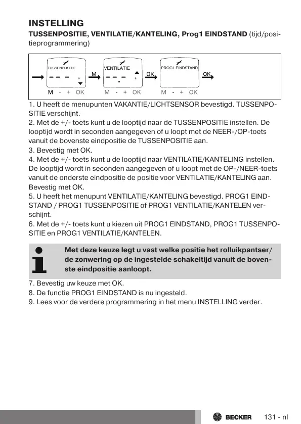 5. U heeft het menupunt VENTILATIE/KANTELING bevestigd. PROG1 EIND-