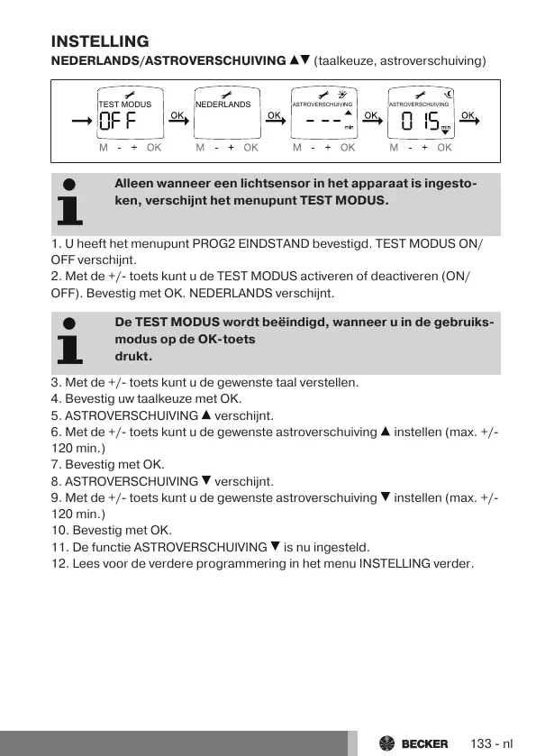 2. Met de +/- toets kunt u de TEST MODUS activeren of deactiveren (ON/