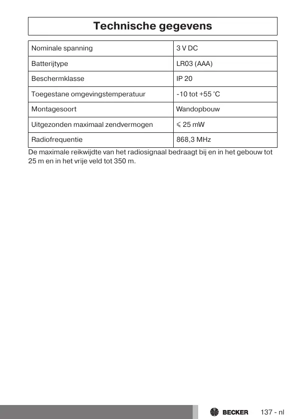 De maximale reikwijdte van het radiosignaal bedraagt bij en in het gebouw tot