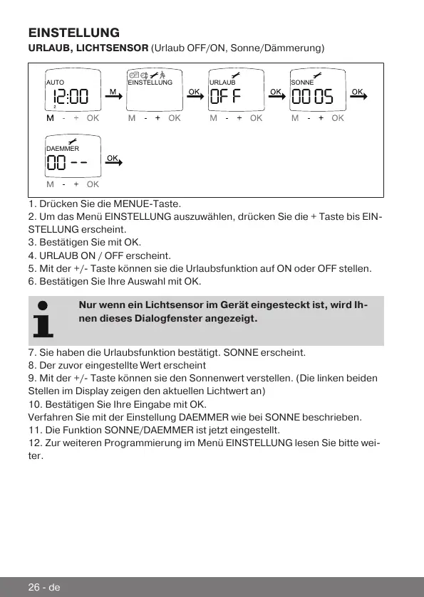 URLAUB, LICHTSENSOR (Urlaub OFF/ON, Sonne/Dämmerung)