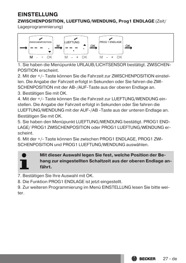 6. Mit der +/- Taste können Sie zwischen PROG1 ENDLAGE, PROG1 ZWI-