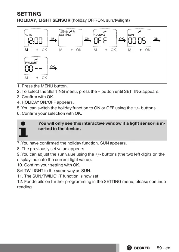 HOLIDAY, LIGHT SENSOR (holiday OFF/ON, sun/twilight)