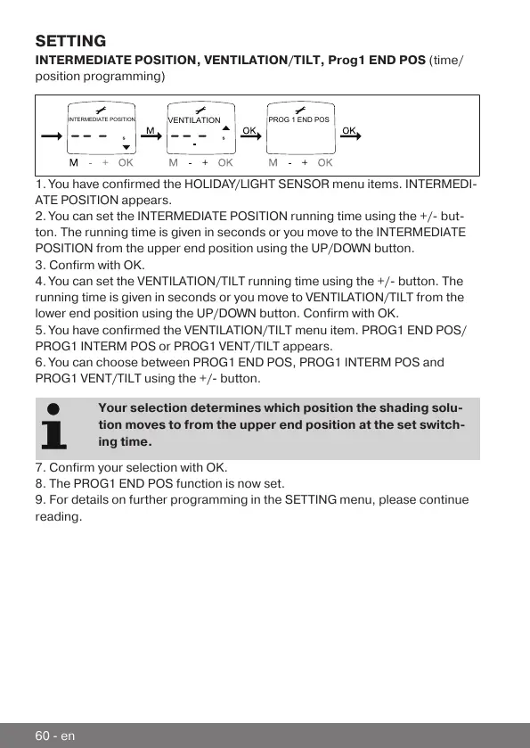 INTERMEDIATE POSITION, VENTILATION/TILT, Prog1 END POS (time/