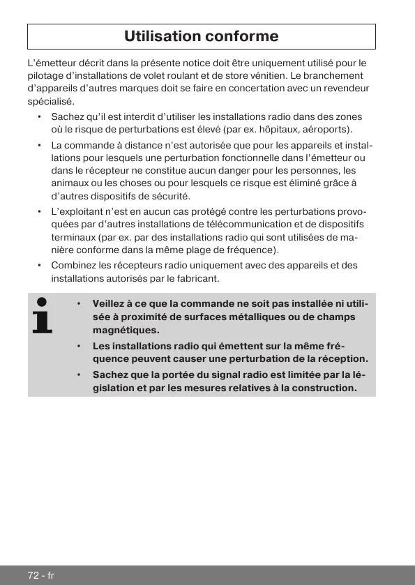 L’émetteur décrit dans la présente notice doit être uniquement utilisé pour le