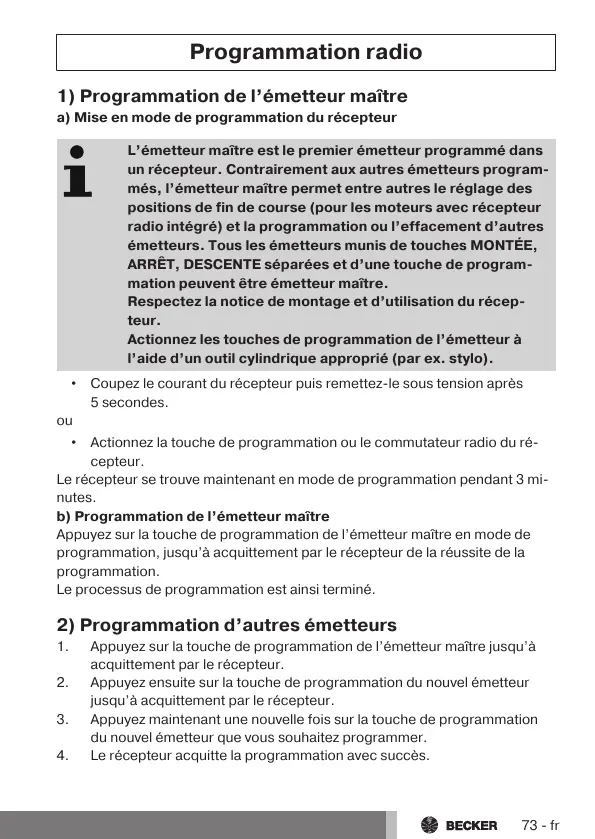 a) Mise en mode de programmation du récepteur