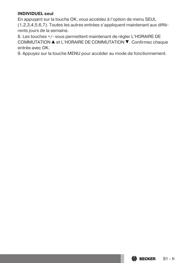 8. Les touches +/- vous permettent maintenant de régler L’HORAIRE DE