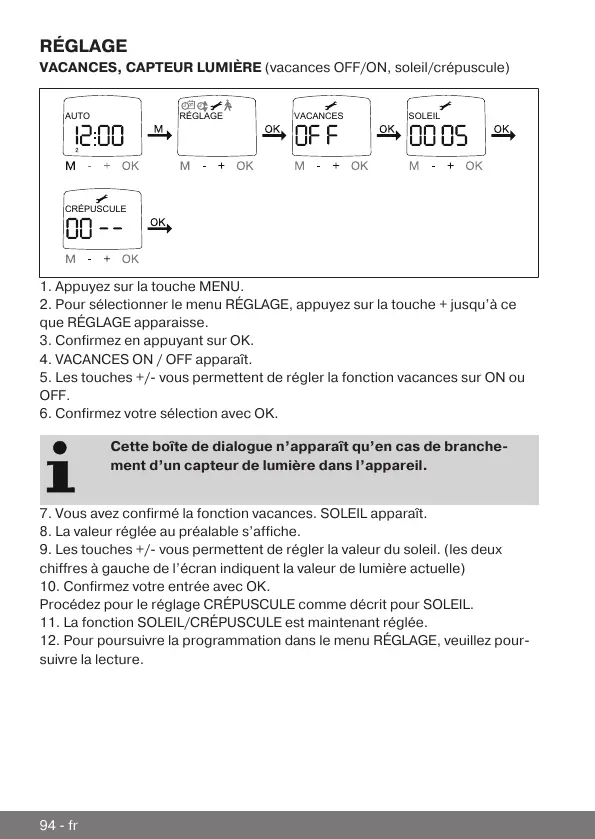 VACANCES, CAPTEUR LUMIÈRE (vacances OFF/ON, soleil/crépuscule)