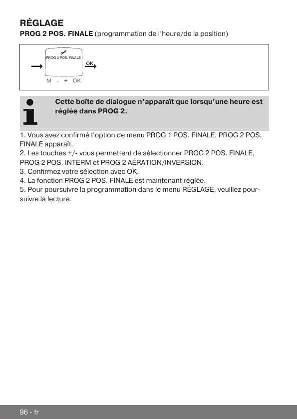 2. Les touches +/- vous permettent de sélectionner PROG 2 POS. FINALE,