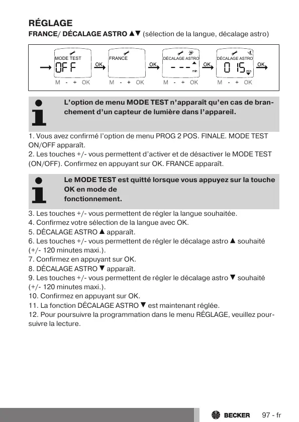 2. Les touches+/- vous permettent d’activer et de désactiver le MODE TEST