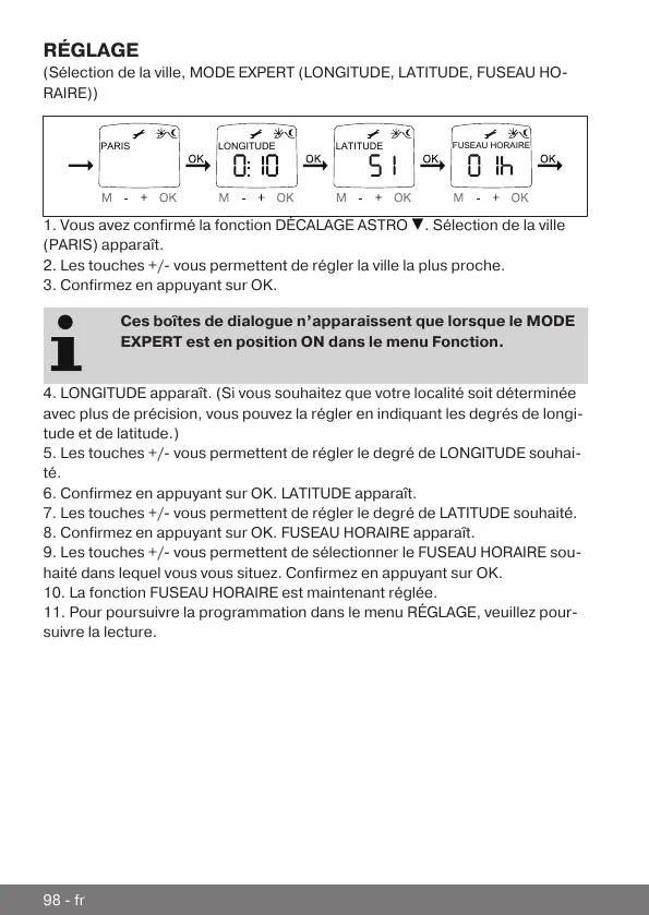 (Sélection de la ville, MODE EXPERT (LONGITUDE, LATITUDE, FUSEAU HO-