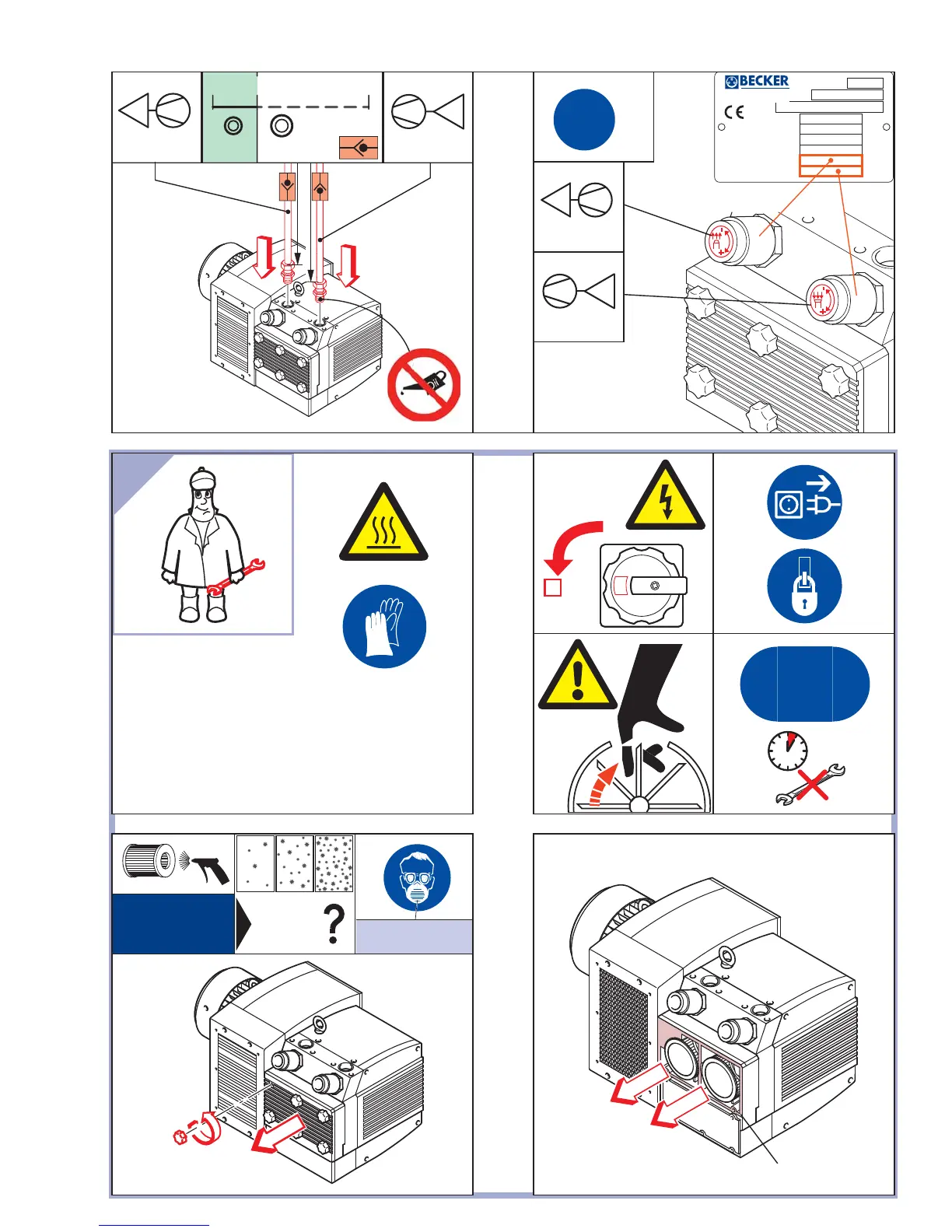 Becker dvt 3.140 - Installation and Operation Procedures; Port Connections for Pressure and Vacuum; Operational Safety and Startup Sequence; Startup and Shutdown Procedures