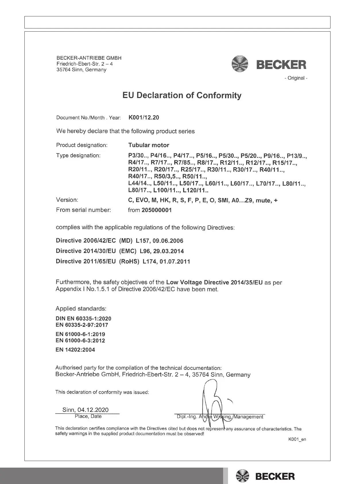 Becker E12 - Declaration of Conformity