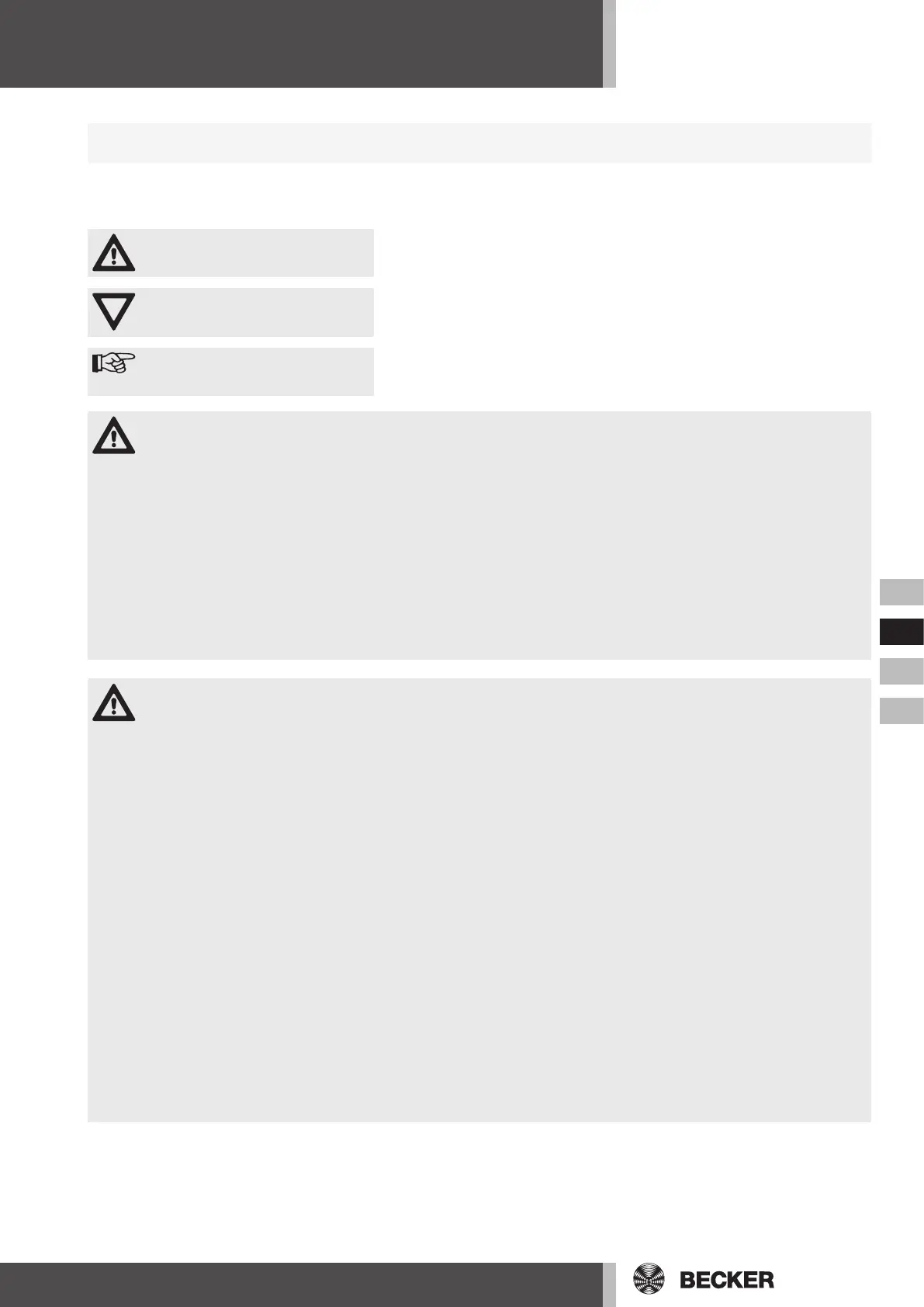 • Only use spare parts, tools and additional devices which are authorised by Becker.