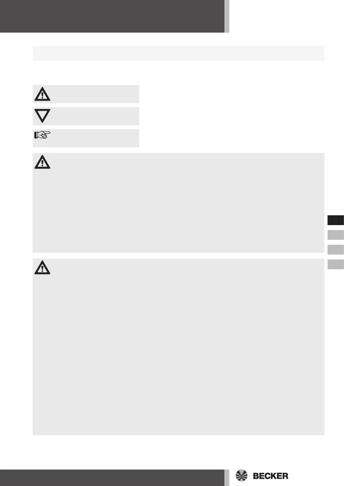 • Es dürfen nur Ersatzteile, Werkzeuge und Zusatzeinrichtungen verwendet werden, die von der Firma Becker