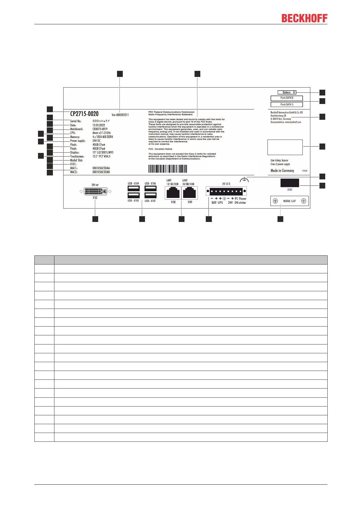 The name plate provides information about the panel PC equipment. The name plate shown here serves