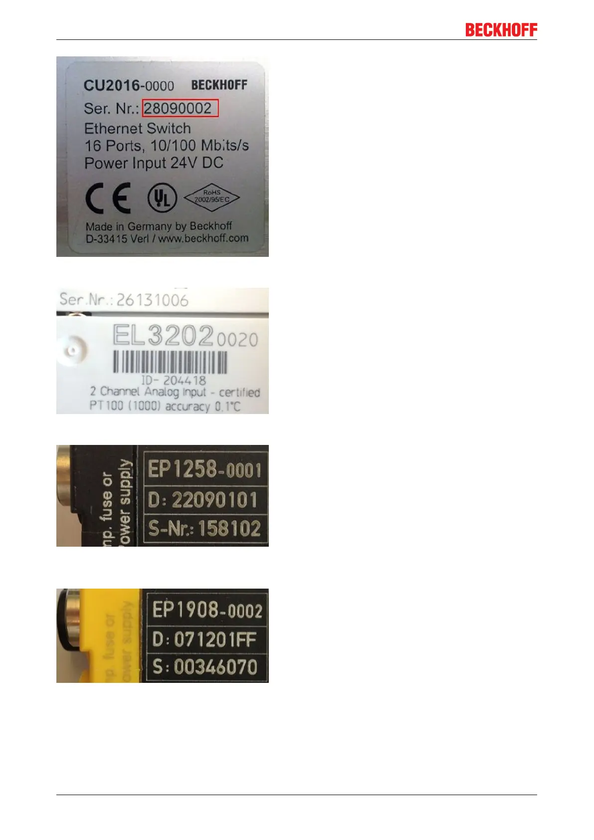 Beckhoff EL3773 - Fig. 3 CU2016 Switch with Serial; Batch Number; Fig. 4 EL3202-0020 with Serial; Batch Number 26131006 and Unique ID-Number 204418; Fig. 5 EP1258-00001 IP67 Ethercat Box with Batch Number; Date Code 22090101 and Unique Se- Rial Number 158102; Fig. 6 EP1908-0002 IP67 Ethercat Safety Box with Batch Number; Date Code 071201 FF and Unique Serial Number 00346070