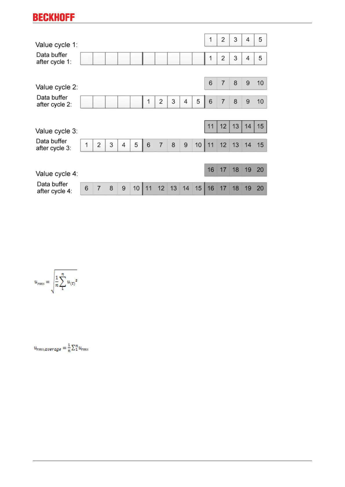 RMS values are calculated by means of a sliding calculation of the entire size of the FIFO buffer in each