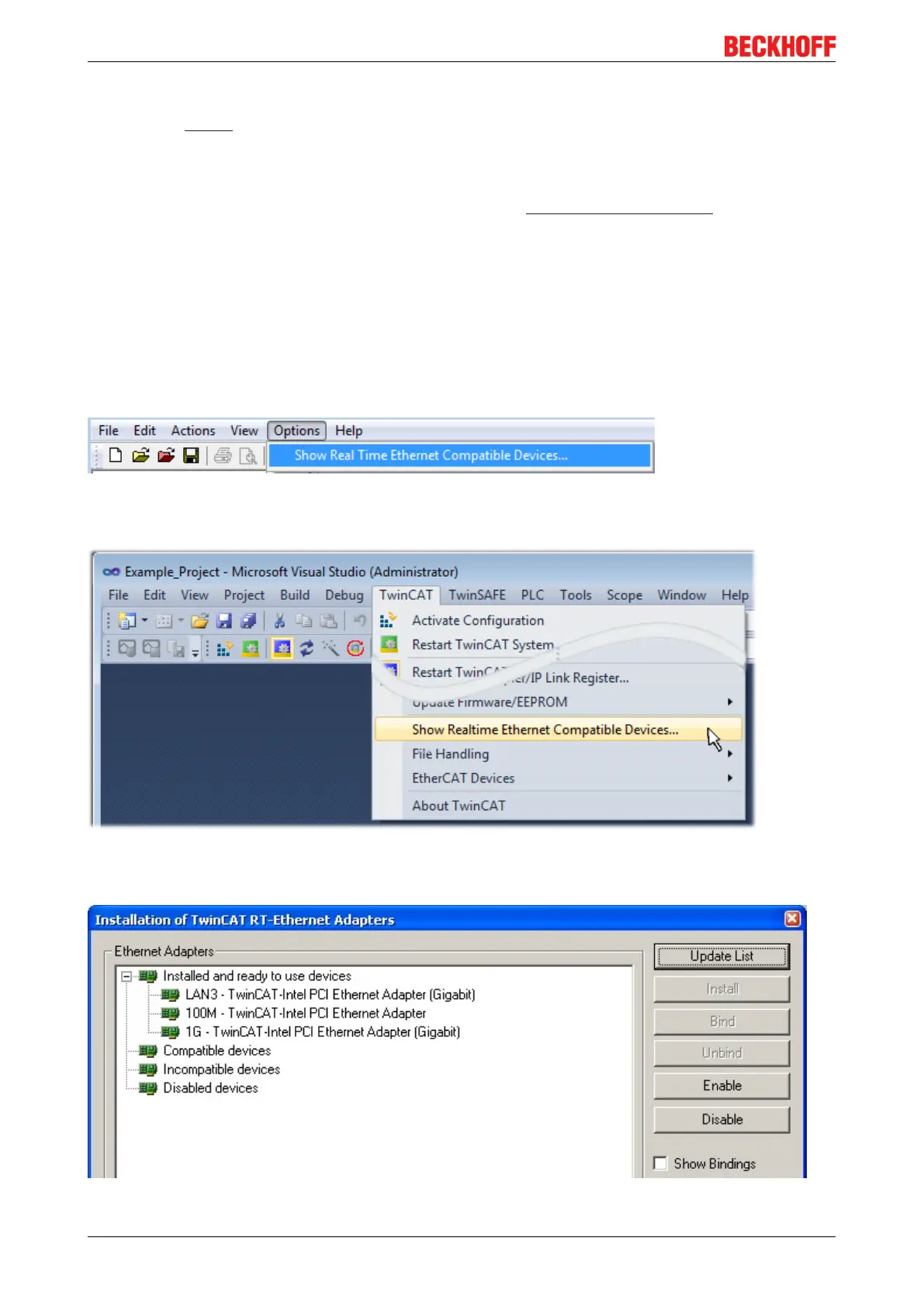 In the System Manager call up the TwinCAT overview of the local network interfaces via Options → Show