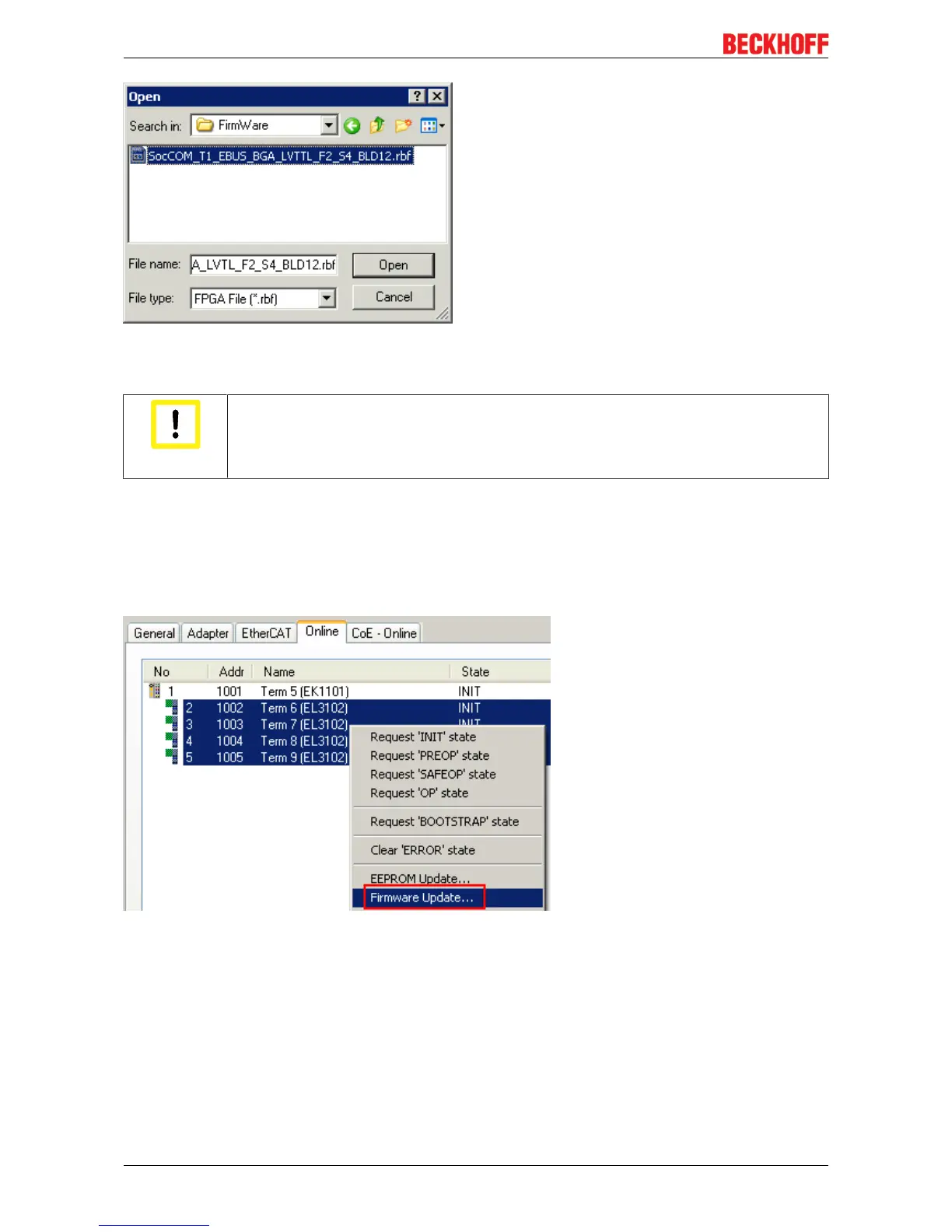 A firmware download to an EtherCAT device must never be interrupted! If this process is