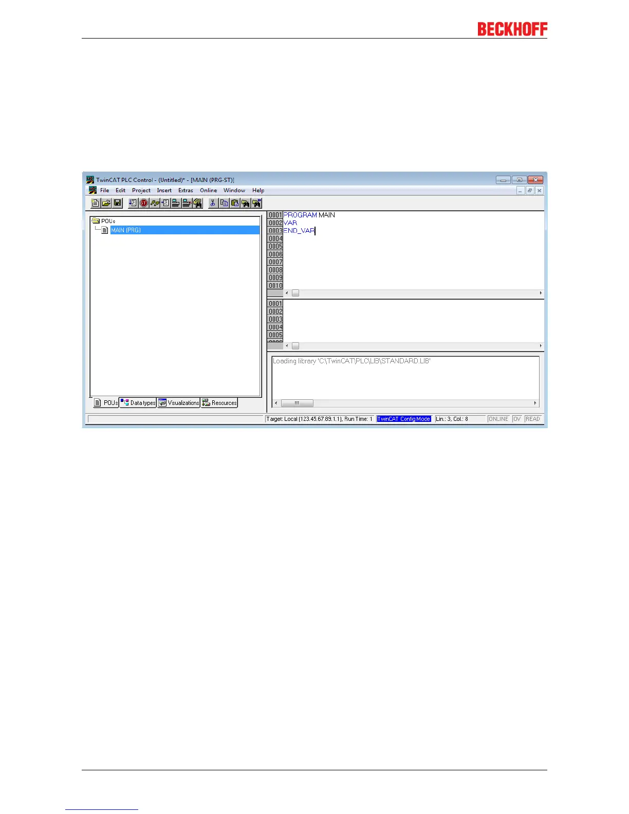 After starting TwinCAT PLC Control, the following user interface is shown for an initial project: