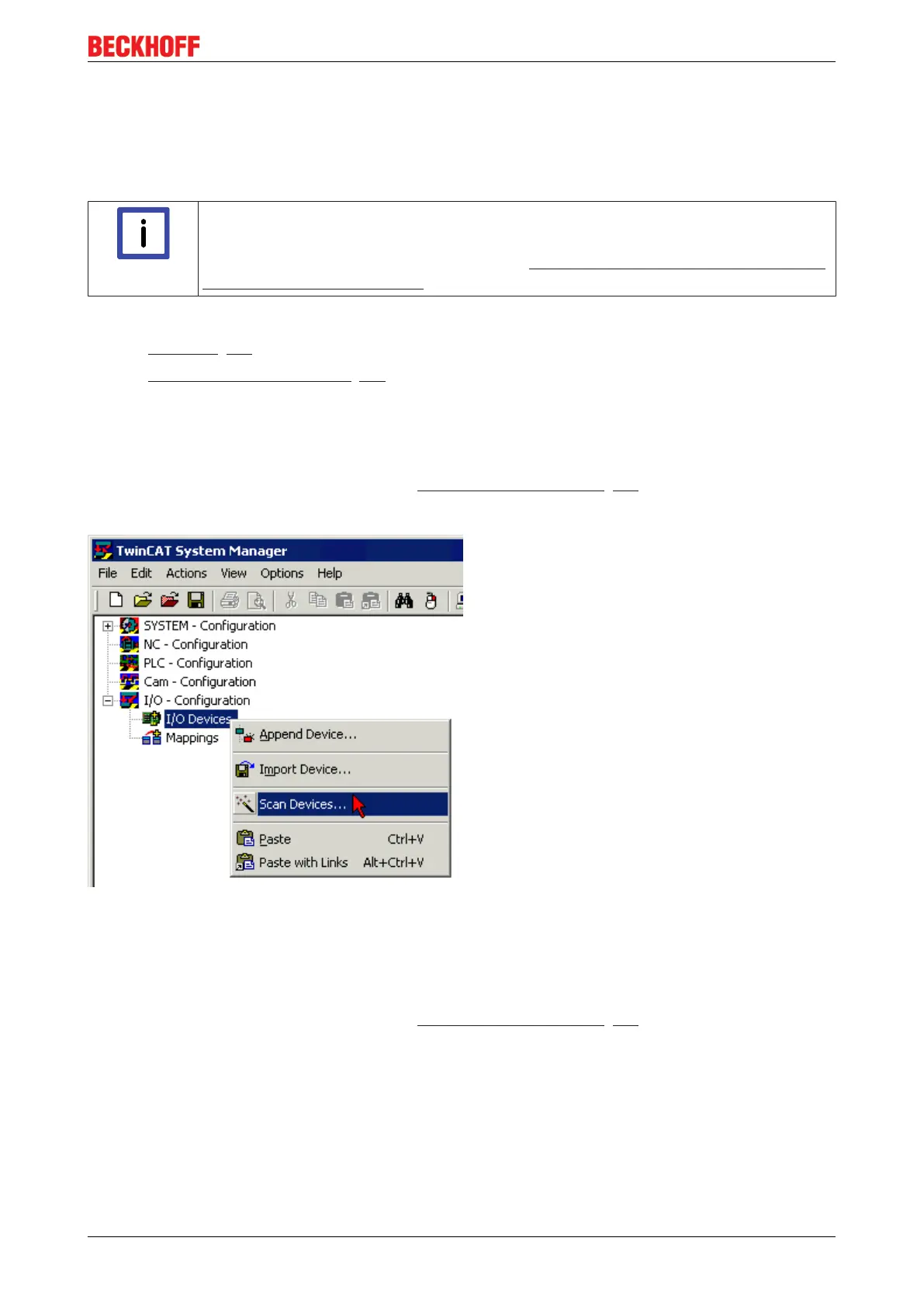 • Switch on the operating voltage, open the TwinCAT System Manager [}66] (Config mode), and scan
