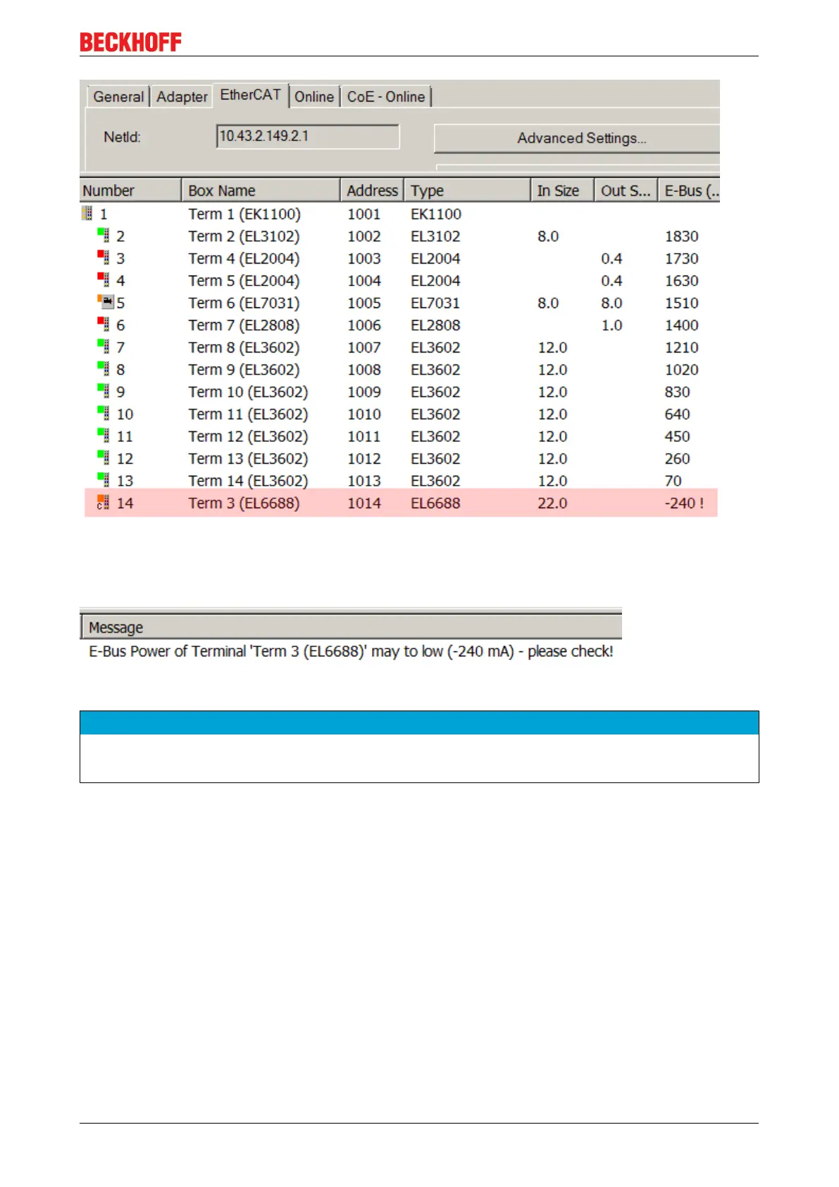 From TwinCAT 2.11 and above, a warning message "E-Bus Power of Terminal..." is output in the logger