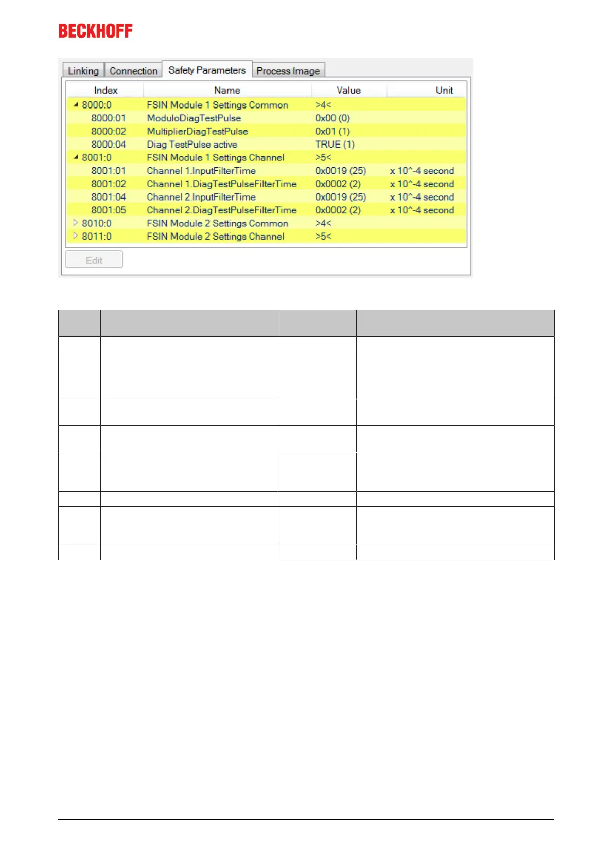 80x1:01 Channel 1.InputFilterTime 0x0019 / 0.1ms Input filter of safe input1. Following this