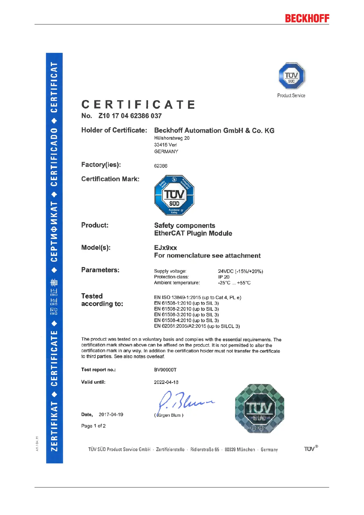 Beckhoff TwinSAFE EJ Series - Certificates