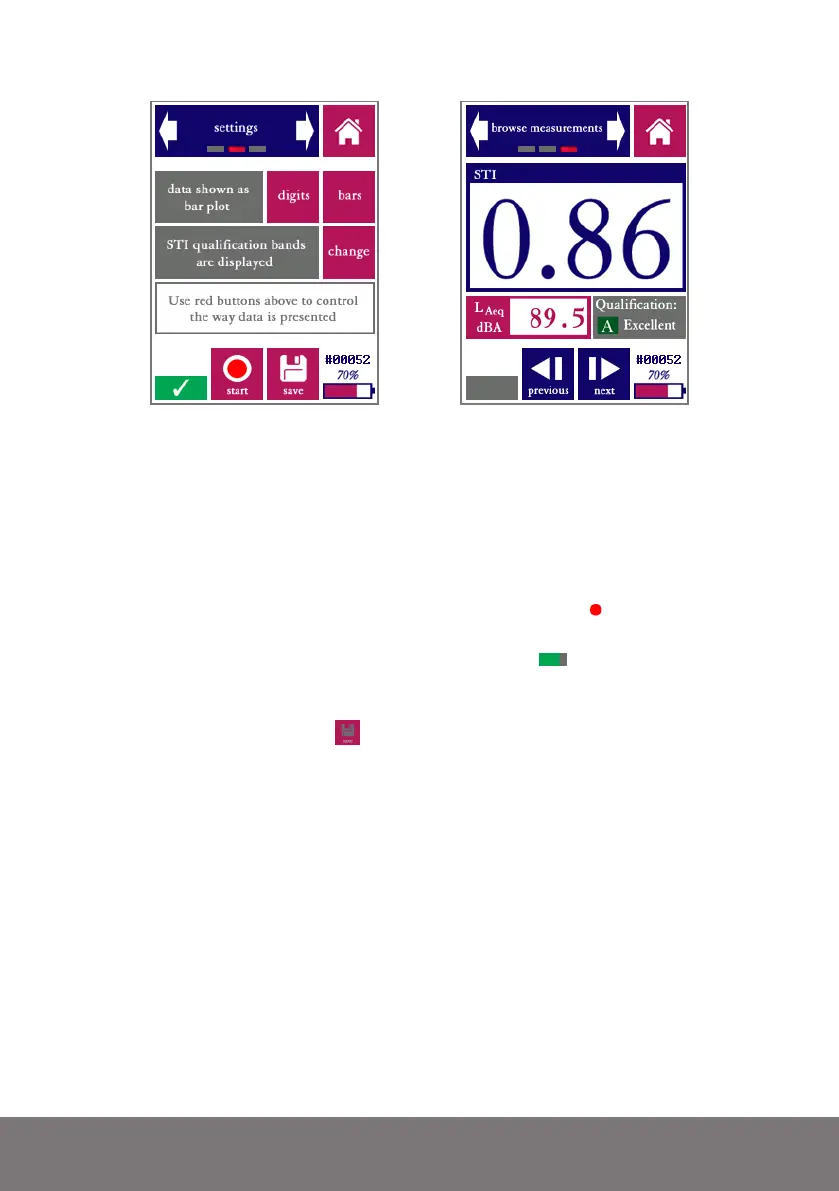 STI measurement screen, but with previous/back buttons instead of start/stop and save buttons.