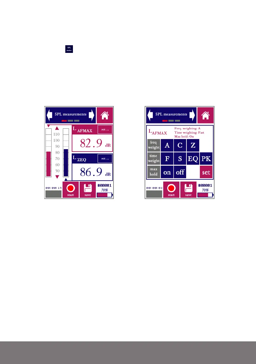 SPL measurements screen, during measurement (left) and with settings keyboard showing
